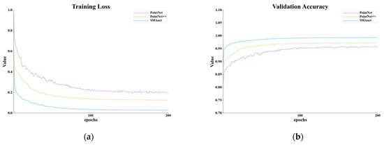 (a) Training loss curves and (b) validation accuracy curves for PointNet, PointNet++ and SMAnet.
