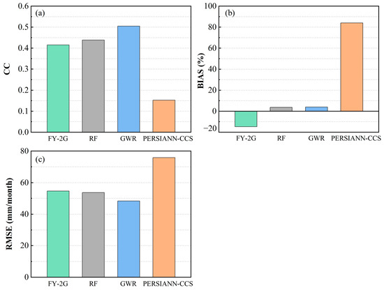 Among the four precipitation products, PERSIANN-CCS exhibits larger rainfall errors within the Songliao River Basin compared to the original FY-2G QPE and fitted QPEs, with the lowest CC values and the highest RMSE and BIAS values. While both PERSIANN-CCS and FY-2G QPEs are precipitation retrieval based on infrared data, the overall performance of the original FY-2G QPE significantly outperforms PERSIANN-CCS over the Songliao River Basin. This is possibly due to the merging of ground observations during the data production process in terms of FY-2G QPE. Compared to PERSIANN-CCS, the performance of fitted FY-2G QPE using RF and GWR is exceptional, indicating that the accuracy of the reconstructed FY-2G QPEs in this region is not worse than this internationally recognized precipitation product. On the other hand, in the study area below 50°N, it is easy to see that the original FY-2G QPE had noteworthy negative BIAS. Meanwhile, RF and GWR effectively diminished such underestimation, suggesting the systematic negative BIAS of the original FY-2G QPE was effectively removed after they were adjusted by the RF and GWR approaches. The underestimation of the original FY-2G QPE is possibly attributed to two reasons: firstly, the FY-2G QPE is derived from a single satellite, and it is only generated from infrared information. The poor performance of FY-2G QPE could primarily result from increased snowfall in the Songliao River Basin. Although FY-2G QPE merged gauge observations in the generation step, less rain gauge data was merged in this product over Northeast China [25]; secondly, there are more missing files in the hourly FY-2G QPE compared to ground observations. Despite accumulating the daily scale data into a monthly scale for this study, the quantity of hourly FY-2G QPE is not constant throughout the day (fixed at 24).