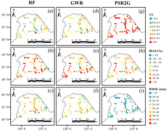 Spatial distributions of temporal continuous metrics for three reconstituted QPEs against the CMPA over Northeast China: RF (a–c), GWR (d–f), PSR2G (g–i).