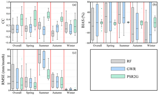 Boxplots of evaluation metrics for three reconstructed QPEs compared to CMPA in different seasons are plotted to conduct the temporal validation, as shown in Figure 7. Overall, PSR2G significantly outperforms the other two reconstructed QPEs in most seasons. In terms of CC, the RF-based reconstructed QPE has higher CC values than GWR in summer and winter, but significantly lower CC values in spring and autumn. However, PSR2G significantly improves the correlation between GWR and ground observations in all seasons, which is consistent with the spatial distribution. With respect to the BIAS, RF and GWR exhibit similar characteristics, they overestimate the precipitation in spring and summer and underestimate the precipitation in autumn and winter. From Figure 7b, the degree of overestimation and underestimation of the reconstructed FY-2G QPE by GWR is significantly lower than RF in almost all seasons. Relative to the reconstructed QPEs based on traditional methods, PSR2G effectively reduces the systematic BIAS of GWR in all seasons. Additionally, except for winter, the performance of the GWR-based reconstructed QPE is superior to RF in most seasons. As for RMSE, the GWR precipitation product has lower RMSE values than RF in most seasons, indicating that the GWR algorithm can alleviate seasonally-related rainfall errors to some extent. Meanwhile, PSR2G significantly reduces the RMSE values of GWR-based reconstructed FY-2G QPE in almost all seasons, especially in the rainy summer season.