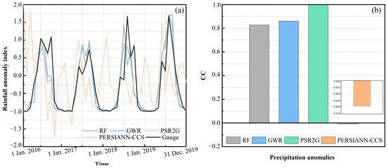Among them, P is the current monthly rainfall for reconstructed QPEs, satellite-based QPEs or ground observations; is the monthly average precipitation of historical series for this precipitation products. The precipitation data are sorted in descending order, is the average of highest rainfall values in the top ten; is the average of lowest month rainfall values in the bottom ten. denotes the positive anomaly or negative anomaly based on positive or negative values.