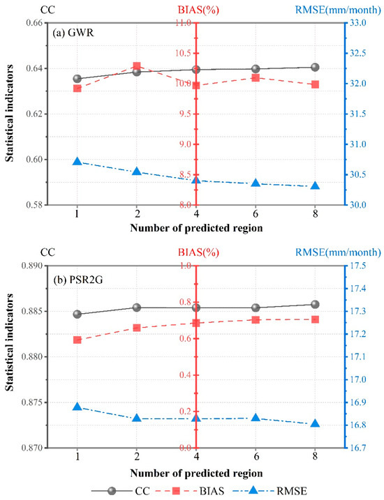 To better analyze the influence of the distance between the prediction area and the reconstruction results, this study plots the performance of GWR and PSR2G under different prediction areas in Figure 11. From Figure 11, we can see at least three pieces of information: Firstly, the accuracy indicators of GWR show significant variations for different numbers of prediction areas, indicating that the GWR model is highly sensitive to the position of the prediction area. Secondly, as the number of prediction areas increases from 1 to 8, suggesting that the prediction area is getting closer to the training area, the accuracy of GWR improves gradually, especially for CC and RMSE. The GWR exhibits the highest CC value and the lowest RMSE value when the number of prediction areas is 8, further validating that the GWR model is sensitive to the position variations of the prediction area. It suggests that as the distance between the training and prediction regions decreases, the density of the encompassed sample during model training also rises in training regions. The precipitation and LSC factors have a stronger spatial correlation in such regions, resulting in land surface environmental data to explain precipitation yields superior performance. Finally, under different subregion numbers, PSR2G significantly improved the performance of GWR, as shown by PSR2G having higher CC, lower BIAS and RMSE than GWR, especially when the subregion number of 8. This also suggests that the improvement of PSR2G over GWR accuracy is also dependent on the accuracy of the original data.