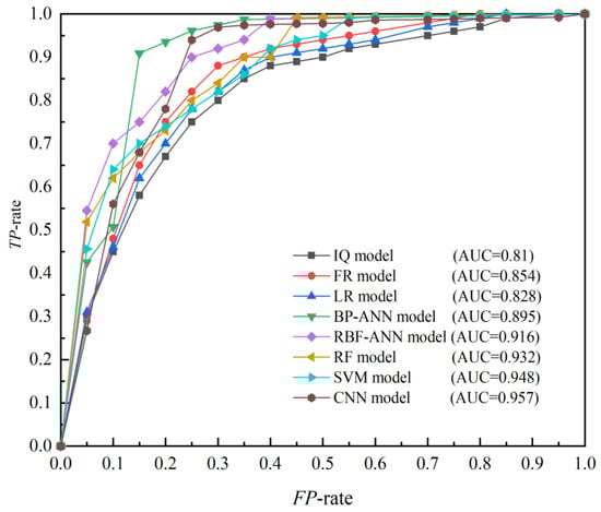 - By comparing the model performance, it was determined that the training and prediction accuracy of machine learning methods was higher than that of the statistical methods. For example, the AUC values for the IQ, FR, LR, BP-ANN, RBF-ANN, RF, SVM, and CNN methods were 0.810, 0.854, 0.828, 0.895, 0.916, 0.932, 0.948, and 0.957, respectively. For the F1-measure of test datasets for different machine learning methods, the largest value was for CNN (0.987), followed by SVM (0.940), RF (0.953), BP-ANN (0.953), and RBF-ANN (0.926). Given other statistical indicators, such as SPE, ACC, and Jaccard, although the performance order varied according to indicators, overall, the CNN method was the best, and the BP-ANN and RBF-ANN methods were the worst. This indicates that CNN has better nonlinear predictive ability than the traditional statistical model. When the nonlinear relationship between landslides and their influencing factors is more complex, the advantage of CNN will be more apparent.