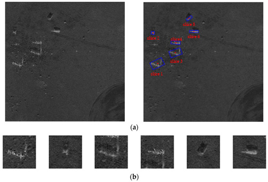 Specifically, false targets are similar to real targets in terms of backscattering intensity, imaging characteristics, geometry, and orientation. They are highly integrated with the background environment. In addition, it is difficult to distinguish the real targets from the false ones by visual interpretation. After morphological processing and area filtering, the target slices are given in Figure 5b.
