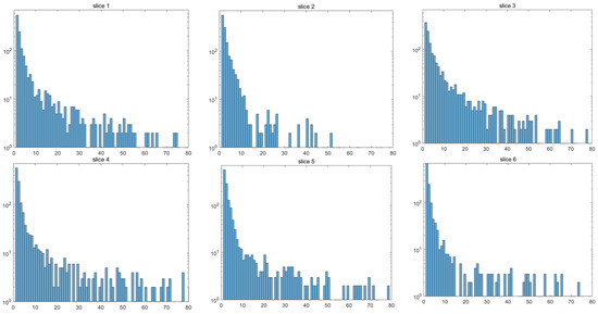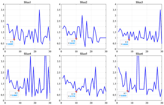 As an example, Figure 7 presents the histograms of difference images derived from the reference and the upper right test images for six target slices. It can be seen that the histograms contain a high-peak region and low-peak region. The corresponding ratio curves of the histogram are given in Figure 8. It is intuitive that when the difference images’ pixels fall into a high-peak region, the neighborhood ratio satisfies , and the first point can be regarded as the dividing point, which is marked in Figure 8. This observation is consistent with the above theoretical analysis. The detection threshold corresponding to each slice is given in Table 3.