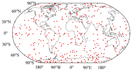 The sub-normal Equation (6) is constructed by using GRACE satellite observations (GRACE Level-1B Release 03) primarily provided by JPL (Jet Propulsion Laboratory). These observations consist of non-conservative force acceleration (1 s) and attitude (1 s) data of both satellites, along with inter-satellite range rate (5 s) measurements. Additionally, kinematic orbits provided by the Graz University of Technology, with a sampling rate of 10 s, are utilized. To mitigate the impact of KBRR data outliers, in accordance with statistical principles, any KBRR data with postfit residuals exceeding triple the standard deviation (STD) value of KBR residuals is down-weighed during gravity field modeling. As an example, the spatial distribution of the identified outliers in February 2011 is plotted in Figure 1, which does not show a clear geographical correlation. Moreover, the proportion of outliers only reaches 0.59%, which is close to the expected result of 0.3% at a confidence level of 99.7% based on the triple sigma criterion.