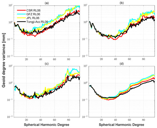 The geoid degree variances w.r.t GOCO06s: (a) January 2003; (b) April 2003; (c) January 2014; and (d) long-term mean over the period from April 2002 to December 2016.