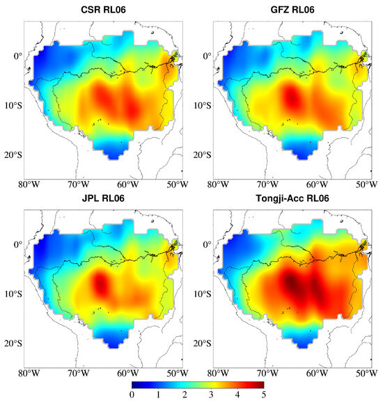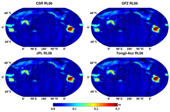 The spatial distribution of the estimated annual amplitudes of mass changes for the period from April 2002 to December 2016 is further depicted in Figure 5, showing a good agreement among the four solutions. In general, the four solutions all retrieve the strong annual signals over lands, primarily in the Amazon River Basin, Greenland, Ganges River Basin in India, Qinghai–Tibet Plateau in China, Zambezi River Basin in Africa, and the Mississippi River Basin, as noted by Meyer et al. (2016) [54]. These results suggest a comparable signal level between the Tongji-Acc RL06 and the other three models.