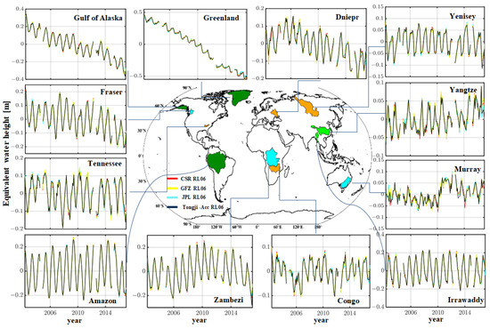 Monthly gravity field solutions have played a crucial role in signal estimates over hydrological and land–ice areas [2,63,64,65,66,67]. In this paper, we have selected ten river basins with varying latitudes and sizes (e.g., Amazon, Tennessee—the smallest sub-basin of the Mississippi River, and Congo River), along with two ice sheets (i.e., Gulf of Alaska and Greenland) for investigation. After applying P4M6 decorrelation filtering and 300 km Gaussian smoothing to the CSR RL06, GFZ RL06, JPL RL06, and Tongji-Acc RL06 solutions, we derived mass change time series for these regions. As shown in Figure 6, there is good consistency among the four solutions, exhibiting pronounced annual amplitudes across these 12 regions. Additionally, both the Gulf of Alaska and Greenland exhibit significant mass loss, which aligns with previous findings by Chen et al. (2011) and Luthcke et al. (2013) [63,68].