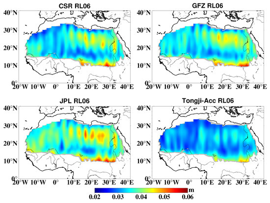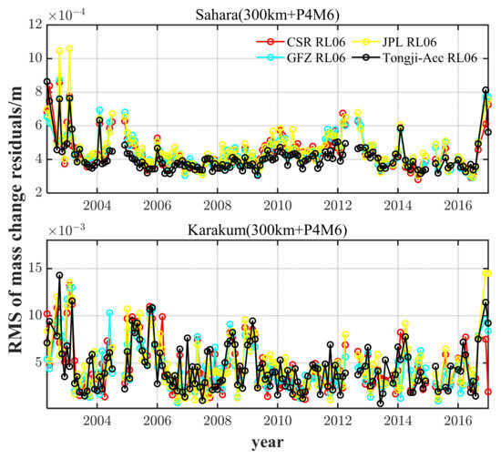 Considering the significant noise characteristics in desert areas [70,71], we selected the Sahara Desert and the Karakum Desert as two examples for analyzing the noise in different gravity field solutions. During the noise analysis, a combination of 300 km Gaussian smoothing and P4M6 decorrelation filtering is first applied, which is considered moderate filtering. After removing significant seasonal terms (including bias, trend, acceleration, annual, semi-annual, and S2 seasonal components) [72], the RMS values of the residual mass variations from the four solutions for the period between April 2002 and December 2016 are illustrated in Figure 7. The noise level in Figure 7 is generally lower for Tongji-Acc RL06 compared with CSR RL06, GFZ RL06, and JPL RL06, since the RMS values over both deserts mainly reflect the noise of monthly models [73]. Additionally, Figure 7 exhibits several individual spikes, which are attributed to poor data quality over certain months (e.g., January 2003, January 2004, September 2004, etc.) [8].