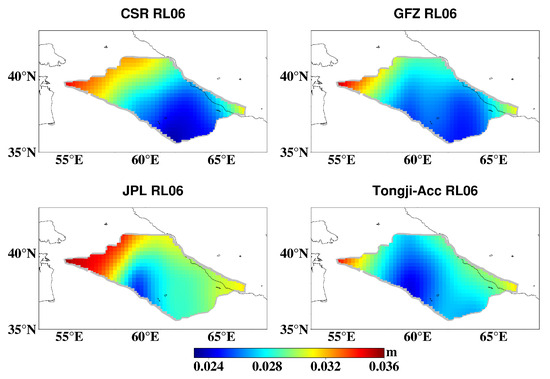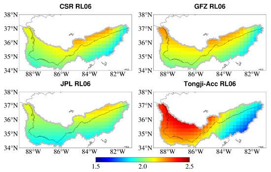 In consideration of correlated noise and high-frequency noise in the GRACE monthly gravity field solutions [25,42], post-processing filtering methods such as Gaussian smoothing [57], DDK filtering [58], and decorrelation filter [59] have to be used. To mitigate the effects of the correlated noise and high-frequency noise, a 300 km Gaussian smoothing and P4M6 decorrelation filtering technology is employed in this section. Furthermore, the degree-one coefficients of the four gravity field models are replaced with the results from Swenson et al. (2008) [60]. The C20 coefficients of the GRACE models are substituted with the outcomes obtained through Satellite Laser Ranging (SLR) [61].