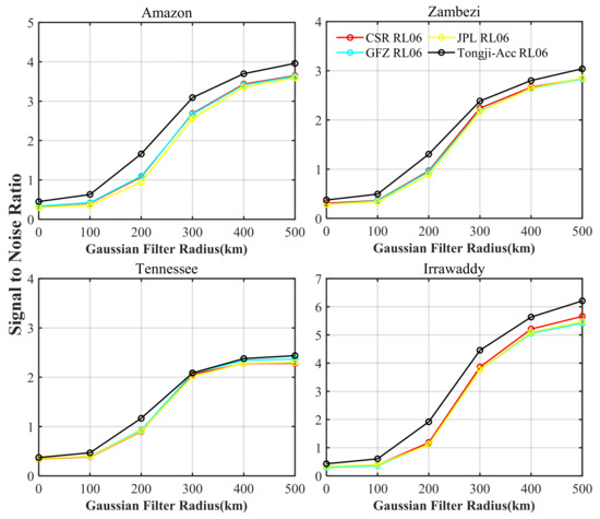 In the previous sections, we primarily analyzed the signal and noise levels of the GRACE models at different scale regions. Although the signal levels are consistent among the four solutions, distinctions in model quality arise due to the presence of both signal and noise components within each individual GRACE model. To accurately assess the quality of the various GRACE models, a feasible approach involves separating the signal from noise and quantifying their respective signal-to-noise ratios (SNRs). In this paper, we select two large-scale river basins (i.e., Amazon and Zambezi) and another two small-scale river basins (i.e., Tennessee and Irrawaddy) as illustrative examples to analyze the quality of various models. During computing the SNRs for the four solutions under different filtering strengths, a combination of P4M6 decorrelation filtering and Gaussian smoothing with varying radii (i.e., 0 km, 100 km, 200 km, 300 km, 400 km, and 500 km) is applied. By subtracting the dominant signal terms (including the bias, trend, acceleration, annual, semi-annual, and S2 seasonal terms) from the filtered mass changes, we obtain the mean RMS value of mass change residuals. This mean RMS value mainly represents the noise level of the model under consideration [74]. Considering the predominant annual signals in the selected river basins, as depicted in Figure 6, we can regard the estimated annual amplitude (AMP) as a signal level [70]. Subsequently, we can derive the SNR value according to SNR = AMP/RMS [27].