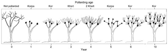 This close connection between people and nature in northern Zagros (located in the West Azerbaijan and Kurdistan provinces, Iran) [14] has led to significant alterations in the vegetative composition [15] and the primary structure of both trees and forest stands [16]. Historically, the high dependence of local forest dwellers on natural resources has made inventive utilization of the forest to supply both human and livestock inevitable [17]. Most forest dwellers practice some sort of silvopastoralism and highly depend on oak forests to produce forage for their livestock throughout the year [18]. In particular, traditional animal husbandry in northern Zagros faces a lack of pastures and fodder in the cold seasons. To adapt their livelihoods to such limitations, the locals have developed a traditional silvopastoral method called pollarding (Kurdish: Galazani) [6,19]. Pollarding is a generic name for pruning tree branches to provide both fodder (for domestic animals) and fuelwood [20]. Pollarding has been reported to be practiced in parts of Europe, Asia, Africa, and America, especially for the benefit of using leaves and branches as animal fodder. Pollarding is hence an important factor in livestock management and relates to this important source of income in the farming economy [21,22,23,24,25]. Oak pollards are a part of traditional forest management in many ecosystems and have a very long history of about 4000 years [26]. In Iran, and as a part of the traditional management system in the northern Zagros, each rural family traditionally owns, i.e., tenures, a part of the forest (Kurdish: Galajar) [27]. Each Galajar is divided into three or four parcels with equal fodder productivity, termed Shanegala (in Kurdish) [28]. This is due to the fact that a given Shanegala is used to perform pollarding for winter fodder each year. Each Shanegala is pollarded in a three or four year pollarding cycle [4,28], which annually occurs from mid-September to early October (pre-fall). However, pollarding is not carried out in this way everywhere and is carried out irregularly [29]. During pollarding, forest dwellers cut leafy branches (Kurdish: Bakhe) of oak trees, mostly Quercus libani Olivier and Q. infectoria Olivier., and store them on large trees (Kurdish: Dargala), on the ground, or on rock fragments in a cone-shaped formation known as a Gala or a Loya Gala (in Kurdish). In winter, dried leafy Loya Gala branches are used to feed livestock (especially Markhoz goats and sheep) [16]. The locals estimate pollarding ages to conduct the above-mentioned pollarding cycle. Whereas a freshly pollarded tree is called Korpa, the tree is termed Kor, Khert, and 2 Khert following one, two, and three years from the time of its pollarding, respectively [30] (Figure 1).