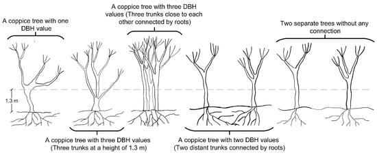The fieldwork revealed that none of the trees in the 6 sites were of seed origin and were therefore all considered coppice trees. Many trees had multiple stems, for which we measured multiple DBH values. Figure 3 represents the structural variations to be expected in our site based on the field observations and according to an experienced local ecologist. We did not examine whether the root networks of individual trees were connected in the field.