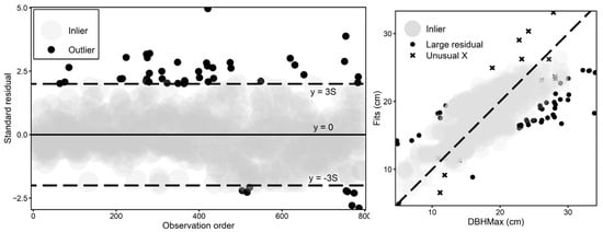 Outlier data in the regression models. The left panel shows the standard residual for data that are >3 and <−3, considered outlier data. On the right panel, outlier data are shown in two categories: large residuals and unusual X.