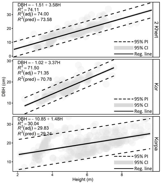 - Dey, T.; Ahmed, S.; Islam, M. Relationships of Tree Height-Diameter at Breast Height (DBH) and Crown Diameter-DBH of Acacia Auriculiformis Plantation. Asian J. For. 2021, 5, 71–75. [Google Scholar] [CrossRef]