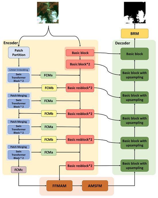 Nevertheless, CNN-based cloud detection models still have limitations due to the diversity of cloud forms and the difficulty of learning long-range dependencies using convolution operations. Recent advances in vision transformer (ViT) [37] technology have demonstrated its ability to learn long-term features and model global information effectively, thus resulting in satisfactory performance on image classification tasks [38]. To overcome the high memory demand of transformers, the Swin transformer [39] designs a hierarchical transformer to limit self-attention computation within nonoverlapping windows. Using the Swin transformer as the backbone, Swin-Unet [40] and TransDeepLab [38] have outperformed other methods in medical image segmentation. To leverage the complementary strengths of CNNs and ViTs, researchers have proposed hybrid models that combine convolution and transformer architectures to extract both local and global features for image classification tasks [41,42,43]. He et al. [44] integrated the global dependencies of the Swin transformer into the features from the UNet’s encoder for remote sensing image segmentation. BuildFormer [45] designs a dual-path structure with a CNN and transformer to extract the spatial details and global context for building segmentation. Yuan et al. [46] proposed the LiteST-Net model to extract building data from remote sensing images, which creatively simplifies the matrices Q, K, and V of the transformer to decrease the model computation. Alrfou et al. [47] concatenated the feature maps of CNN and Swin transformer encoders as the input into the corresponding decoder, and it has been demonstrated that combining transformers and CNN encoders consistently outperforms using CNN encoders along with image segmentation.