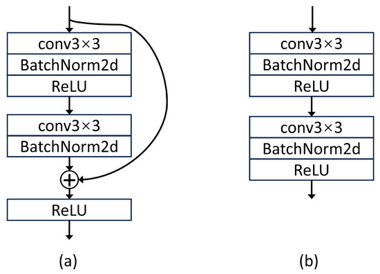 The convolution branch adopts a feature pyramid structure, in which the resolution of the feature maps decreases with network depth while the channel number increases. This branch has six layers. The initial two layers consist of different numbers of basic convolution blocks. The next four layers each contain two basic residual blocks, thus following the architecture of ResNet18 [48]. The structures of the basic convolution block and basic residual block are illustrated in Figure 2. Among these layers, max pooling is employed to decrease the spatial resolution.
