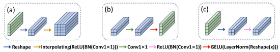 The feature coupling module is designed to eliminate the misalignment between the convolution branch and the Swin transformer branch. The feature sizes of the convolution layer and Swin transformer layer are different. The feature maps of the convolution block have the size (B, C, H, and W are the batch size, channels, height, and width, respectively), while the shape of the feature maps from the Swin transformer block is (B, L, and C are the batch size, number of tokens, and dimension, respectively). When fed to the convolution branch, the feature maps outputted from the Swin transformer layer must be upsampled to the same spatial scale. Next, the channel dimension is processed through a convolution operation to align with that of the corresponding convolution layer; then, the resulting features are concatenated with those of the convolution layer. Those processes are shown in Figure 4a. When transitioning from the convolution branch back to the Swin transformer branch, the feature maps first undergo a convolution to match the channel dimension. Afterward, the feature array is flattened to ensure that it has the same dimensionality as the feature maps from the Swin transformer layer, as depicted in Figure 4b. In the end, the spatial scale of the feature maps outputted from the Swin transformer branch is the same as that outputted from the convolution branch so that, as shown in Figure 4c, the process of the FCM(c) is identical to that of the FCM(a), with the sole difference being the absence of interpolating.