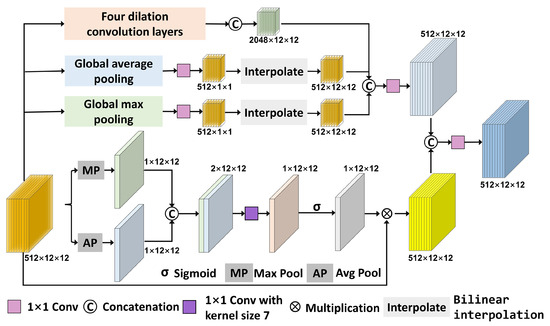 Capturing representative features at multiple scales plays a crucial role in numerous visual tasks [53]. Dilation convolution [54] and the pyramid structure [55] are widely adopted to augment semantic information. Dilation convolution can effectively capture long-distance correlations, which are beneficial to the segmentation of large objects. Pooling is frequently utilized to acquire feature maps at different scales, yet it may have poor, limited effectiveness when dealing with scattered small-scale objects. The use of large square kernels in dilation convolution and pooling operations often results in the extraction of excessive information from irrelevant regions, thereby leading to the loss of fine-grained details. In response to these problems, the Atrous Spatial Pyramid Pooling (ASPP) module proposed in DeepLabv3 [56] is a spatial pyramid module composed of dilation convolution with different rates and an average pooling. Zhu et al. [57] added the attention mechanism in DeepLabv3+ [58] to detect foreign object debris on an airport runway. Additionally, in the task of cloud detection, where clouds can display a wide range of shapes and frequently have indistinct boundaries, the acquisition of more effective features becomes a critical consideration.