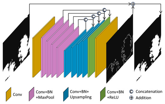 In this paper, we still utilized a simple encoder–decoder module to process the output of the decoder part to refine the cloud boundary. Subsequently, we combined the refined boundary information to the decoder’s output to produce the final cloud mask by numerical addition. Figure 8 shows the structure of our boundary refinement module. There are three parts in the BRM: an encoder, a decoder, and a transition layer. The BRM operation serves to enhance boundary features and capture fine details, thus effectively mitigating the potential blurring of the boundaries of cloud masks. In summary, the boundary-refined architecture provides a simple yet powerful result in cloud detection.