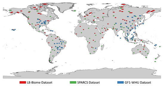 The images we used in the GF1-WHU, SPARCS, and L8-Biome datasets are distributed in global regions, which are shown in Figure 9. The details of those datasets are listed in Table 1.