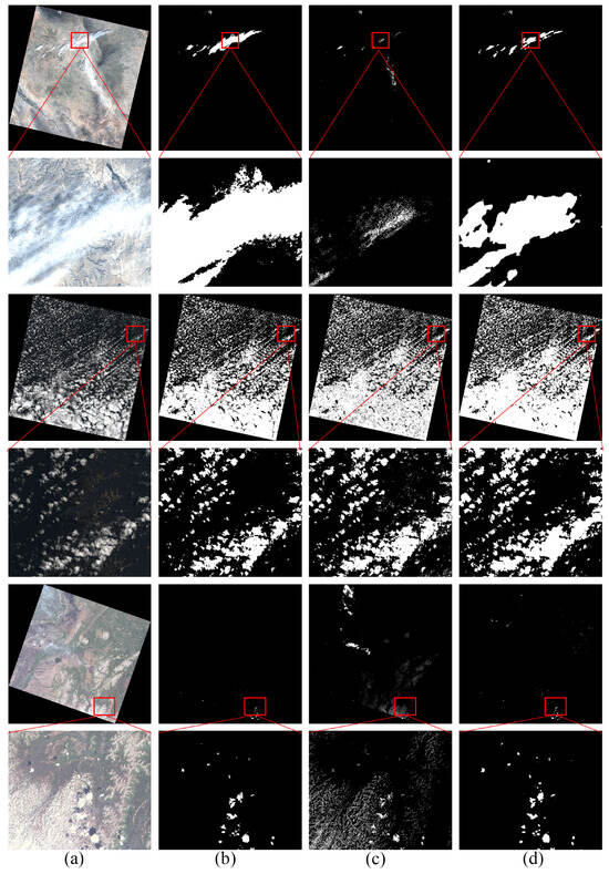 At the end of the STCCD model, we added the enhanced edge features obtained from the BRM into the feature maps produced by the decoder section. This integration results in cloud masks exhibiting sharper boundaries and finer details. In our experimental results, the inclusion of the BRM led to an improvement in the F1_cloud from 92.42% to 92.45% and in the MIoU from 91.90% to 91.96%.