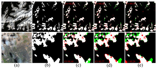 Prediction of STCCD, LiteST-Net, and BoundaryNet for clouds over snow and clouds over bare soil on the SPARCS dataset. Black and white represent the noncloud and cloud pixels, respectively, green represents cloud pixels that are missed, and red represents that the noncloud pixels are detected as clouds. (a) RGB image. (b) Label. (c) Our network. (d) LiteST-Net. (e) BoundaryNet.