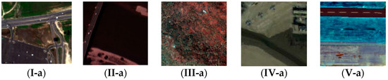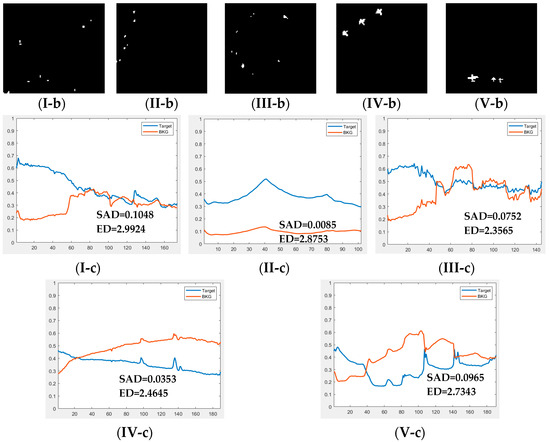 I refers to the dataset for HYDICE Urban Scene. II refers to the dataset for Pavia Scene. III refers to the dataset for Hyperion Scene. IV refers to the dataset for San Diego Airport scene. V refers to the dataset for Gulfport Scene. (a) Pseud-color image; (b) ground truth map; (c) and the mean spectrum of target and BKG.