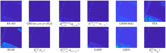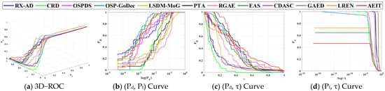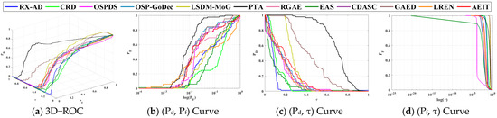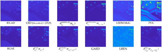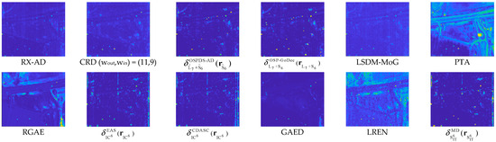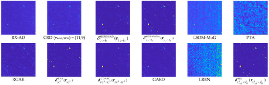 By the visual inspection of Figure 15 and Figure 16, the best detection performance of decomposition-based methods, which are OSP-GoDec, CDASC, and AEIT, is generated by . The detection power in the anomaly space is low in . Table 10 depicts the 3D ROC curve-derived criteria corresponding to the detection results in Figure 15. The detection power of PTA was better than other methods. However, PTA also obtained the worst BKG suppressibility. The detection power of AEIT in San Diego Scene is the third best with AUCADP = 0.162, solely behind PTA and LSDM-MoG, which achieve the two worst BKG suppression performance. From the overall performance, achieved the best BKG suppression performance and a satisfactory target detection power with the highest computational complexity. Taking into account the nine detection criteria, it can be reasonably demonstrated that was the second-best anomaly detector. LREN exhibits a strong target saliency; however, it also tends to produce a higher number of false alarms in the detection results, which is similar to PTA. On the other hand, GAED achieves similar results to RGAE in terms of target detection and background suppression. For this type of anomalies, the proposed detection operator in this study achieves satisfactory results, approaching the performance of OSP-GoDec and GAED.