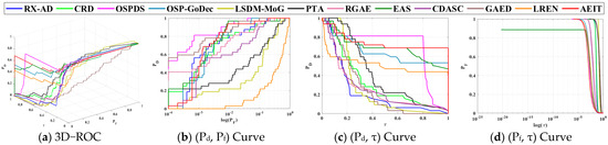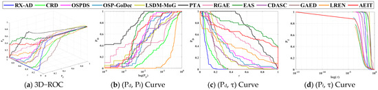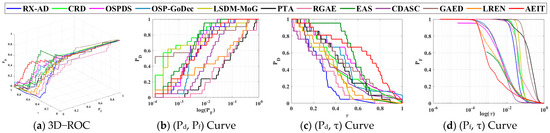The optimal results achieved using CRD with (wout,win) = (15,3) in [42], in [19], in [15], and in [20], respectively. By the visual inspection of Figure 11 and Figure 12, the BKG suppressibility of and were observed to be significantly better than those obtained using PTA, RGAE, and . Table 8 also tabulates their 3D ROC curve-derived nine detection criteria where once again the BKG suppressibility and overall performance of AEIT were better than those of all other compared anomaly detectors. Furthermore, the detection power of is only slightly lower than that of , indicating a higher occurrence of false alarms with the visual inspection. LREN obtains the best target enhancement effect but generates a worse BKG suppression.