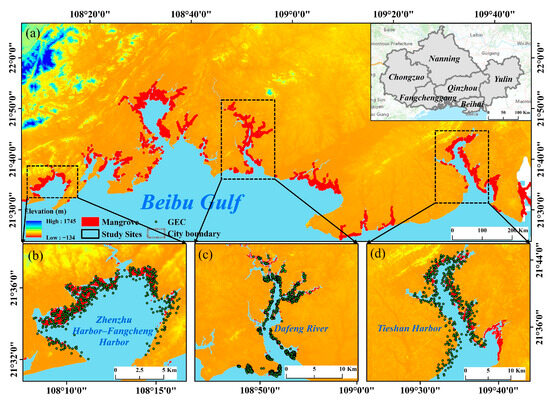 Figure 1. Locations of study areas: (a) the Guangxi Beibu Gulf, (b) Zhenzhu Har-bor–Fangcheng Harbor in Guangxi (ZZW), (c) Dafeng River in Guangxi (DFJ), (d) Tieshan Harbor in Guangxi (TSG).