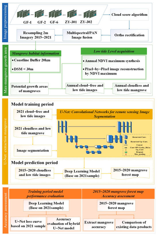 The overview of the workflow for mangrove extraction and evaluation is outlined in Figure 2 and mainly consists of four parts: (1) image preprocessing, (2) mangrove maximum growth area assessment, (3) U-Net mangrove extraction, and (4) accuracy assessment. Image preprocessing: the satellite images were preprocessed to obtain a high-resolution multisource image set with a spatial resolution of 2 m (m for meters) for 2015–2021. Mangrove maximum growth area assessment: Based on the habitat characteristics and NDVI, we acquired cloud-free images during the low-tide period for mangroves, representing the maximum growth area of mangroves. Extracting the maximum mangrove growth area, which is used for U-Net mangrove extraction, is crucial for the “full mapping” of the semantic segmentation model. U-Net mangrove extraction: Accurate determination of the maximum mangrove growth area contributes to achieving a “full mapping” relationship between stable samples (2021) and the spatial scale of remote sensing images. On this basis, image detection and segmentation were performed on the annual cloud-free mangrove images. Multiple-source image segmentation results were extracted using a blended U-Net model, which was used to derive mangrove maps for multiple years (2015–2020). Accuracy assessment: the accuracy of the mangrove maps was verified based on validation sample sites and field survey results, and quantitative and qualitative analyses were performed via comparing multi-person visual interpretations with existing data.