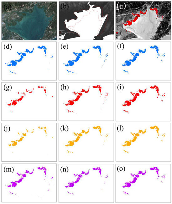 Figure 7. Hybrid U-Net mangrove extraction results compared with existing data products. (a) The satellite image of mangrove area at ZZW, (b) mangrove habitat information results, (c) low tide level acquisition results, (d,g,j,m) the hybrid U-Net results in 2020, 2019, 2018, 2015, (f,i,l,o) the Global Mangrove Watch (GMW) in 2020, 2019, 2018, 2015, (e) LREIS in 2020, (h) TW in 2019, (k) MCina in 2018, (n) CAS in 2015.