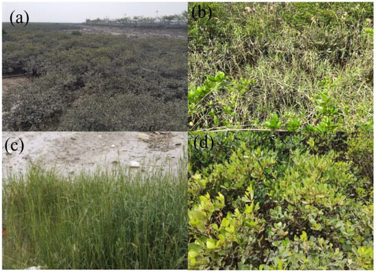 Figure 10. Field investigation: mangrove (a,d), Spartina alterniflora (b), reed (c).
