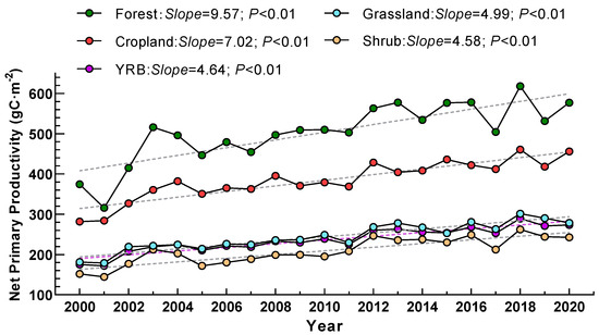 Moreover, the land-use type was assumed to remain unchanged from 2000 to 2020 in this study, while disregarding the potential impact of changes in land-use type on vegetation NPP. Therefore, our study assumes no change in vegetation types from 2000 to 2020, which may lead to uncertainty in NPP analysis in the YRB, because vegetation in the Yellow River Basin has been affected by ecological restoration projects, and vegetation types have changed in the past 20 years. Therefore, future studies should aim to consider what will happen to NPP as vegetation types change.