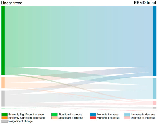 Percentage of area converted from linear trend to EEMD trend (%).