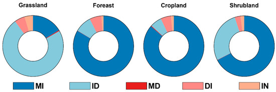 For different vegetation types, the proportion of monotonic increase in forests (83.41%) and croplands (86.35%) were higher than that of others (Figure 8). Although the area of MD trend in most vegetation types was low, the area of ID occupied approximately 73.22% in the areas of the whole grassland, and about 27.47% of the whole shrublands.