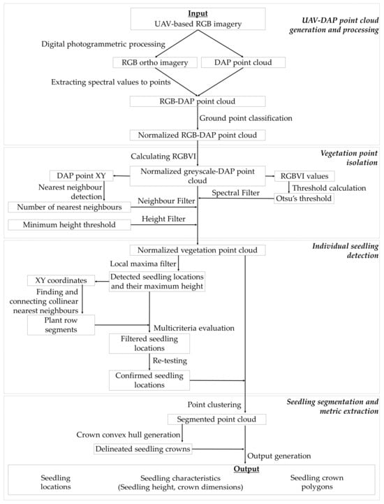 In this study, we have developed an unsupervised method to detect and map young conifer seedlings using point clouds and orthomosaic imagery generated from high-resolution UAV-based RGB imagery through DAP. The processing pipeline comprises four main steps: (i) generating UAV–DAP point clouds from UAV RGB imagery, (ii) isolating vegetation points by utilising RGB spectral information from the UAV–DAP point cloud to eliminate non-vegetation points, (iii) identifying individual seedlings through a combination of structural and spatial details such as spacing and height, combined in a weighted scoring approach to detect potential seedling locations, and (iv) segmenting seedling crowns and extracting attributes like height and crown dimensions.