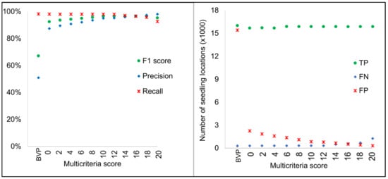 At all sites, the false positives that remained after the vegetation point isolation stage originated from the weeds and regen that were not eliminated by the binary thresholding technique due to their spectral and structural similarity to the planted seedlings. Most of these false positives could be removed by increasing the cut-off score, further emphasising the advantage of using a combination of spectral, spatial, and structural metrics. However, it is crucial to understand that the increased precision comes at the cost of a higher number of false negatives, i.e., predictions that incorrectly indicated the absence of a seedling.
