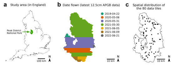 Orthorectified aerial digital photography of the entire PDNP (1439 km) was obtained at 12.5 cm ground resolution through the Aerial Photography Great Britain (APGB) agreement for UK public sector bodies [30]. Standard aerial photography images were used, containing red, green, and blue (RGB) wide spectral channels and collected at seven different dates between April 2019 to June 2022 (Figure 1b).