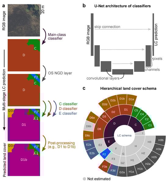 Multi-stage semantic segmentation approach, where (a) land cover (LC) is predicted from RGB images in multiple stages: classification of the main class, overlaying the OS NGD layer, classification of the detailed subclasses, and post-processing to further split up subclasses (based on soil data). (b) The classifiers are Convolutional Neural Networks that use the U-Net architecture, consisting of convolutional layers as well as skip connections [14,34] to map RGB images to LC predictions. (c) The LC schema is hierarchical, and multiple classifiers and post-processing layers are used to predict all subclasses. Colours correspond to the steps in panel (a). LC codes are explained in Table 1.