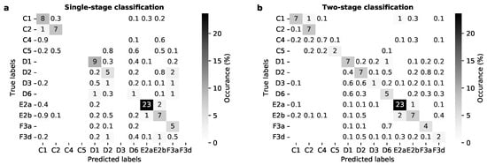 We developed a multi-stage approach because of the hierarchical LC schema, the high number of classes (23), the strong non-uniformity of the class distribution (Figure 3) and the intra-class variance caused by the large area of interest (PDNP, 1439 km2). The classification process was split into four stages (Figure 2a). First, one CNN model was used to predict the main classes directly from the RGB data (Figure 2a, first step). Second, OS NGD data were used to overwrite these predictions with any F2 (open water), G (rock) or H (developed land) LC class (Figure 2a, second step). Third, three separate CNN classifiers were used for the prediction of the detailed sub-classes (Figure 2a, third step). These detailed predictions were then masked using the combined classes from the previous step. For example, the output of the C-classifier would predict, directly from the RGB data, detailed C1, C2, C4 and C5 classes (see Table 1) at locations classified as C by the main classifier. Fourth, soil data [45] were used to disambiguate between subclasses of D (moorlands) with or without peaty soil: e.g., D1a or D1b (Figure 2a, fourth step).