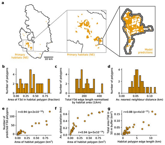 Wet grassland and rush pasture is an important habitat, even in small patches, for a range of species including wetland birds, invertebrates, herpetofauna and small mammals if managed sympathetically [65,66]. Furthermore, this habitat has become increasingly present in marginal farmland as a result of the change of focus of farm subsidies and farming practices in the uplands over the last few decades [47]. Our objective was to leverage multi-stage semantic segmentation to accurately measure the extent of this habitat, not only as large vegetation stands but also as isolated patches within other primary vegetation classes and as common components of complex semi-natural vegetation mosaics [65]. We found that the spatial structure of wet grassland and rush pasture within these primary habitat areas showed substantial variation at fine scale (Figure 9b–d) using multiple habitat fragmentation indices [50,51]. At the same time, the CNN predictions revealed consistent spatial relationships that emerged across primary habitat areas (Figure 9e–g).