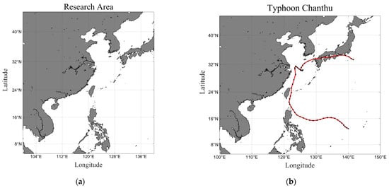 (a) Research area in the Northwest Pacific Ocean; (b) Typhoon Chanthu movement route.