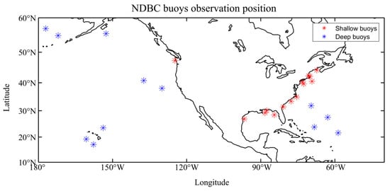 We select data from 14 shallow-sea buoys (nearshore) with depths greater than 50 m and 12 deep-sea buoys (offshore) with depths greater than 1000 m in 2021, and use the following buoy data to fit the wave parameters. The data that need to be used are the significant wave height, the mean wave period, and the wind speed. Table 2 shows the latitudinal and longitudinal information, as well as the buoy numbers and types in the ocean. In addition, the blue dots in Figure 2 represent deep-sea buoys, and the red dots represent shallow-sea buoys.