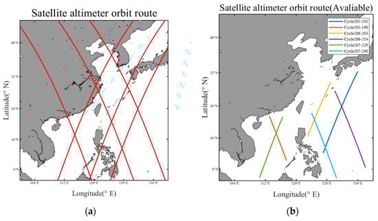 Jason-3 satellite altimeter orbit route from the NCEI (a) and available data (b).