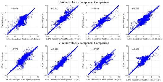 Then, we compared the wind speed, which is divided into a U component in the horizontal direction and a V component in the vertical direction. In Figure 5, the X coordinate is the wind speed component of the model output, and the Y coordinate is the custom component of the ERA5 reanalysis wind field. To achieve the best test effect in terms of time, we chose one time every three days from 4 September 2021 to 25 September 2021 and made a comparison at each chosen time to distinguish the U direction from the V direction. We calculated the correlation coefficient, and found that the r values of all the data were above 0.97. The minimum r was 0.972, and the maximum r was 0.990, which demonstrates that the SWAN output wind data and reanalysis wind data are highly consistent, and the correlation between the wind field data output with the model and the reanalysis data is strong. It can be concluded from the figure that, compared with the wind field driven with the same model, the wind field output of the model has regression stability.
