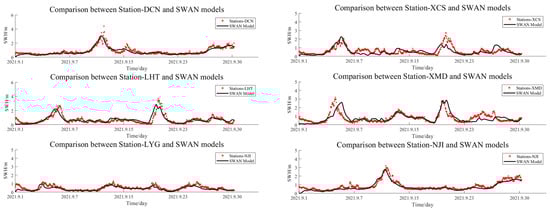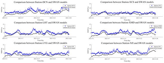 In Figure 6, the data from six observation stations are compared with the model data. Red dots represent the measured values of the station data, and black lines represent the output of the simulated values of the SWAN model. The parameter simulated using SWAN is in good agreement, and the corresponding trend and numerical value of each factor are obtained. Some stations have poor results, such as the XMD station, and the spectral peak simulation effect is poor. According to Table 4 and Figure 6, we conclude that NJI, LHT, and DCN have the best fitting effect, with values not higher than 0.3 and values not higher than 30%. The is also within 0.4. The of all stations is over 0.65. Among them, the best simulation effect is NJI, with an reaching 0.93.