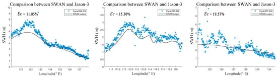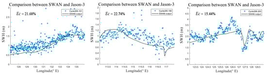 The offshore comparison data are altimeter data (from NCEI, Jason-3, in Figure 3). The purpose of introducing data is to test the simulation effect of the SWAN model in the ocean. We introduce six satellite altimeter scanning orbits and take orbit measurement data at six different times for verification. We calculated the between the two sets of data to test the simulation ability of the SWAN model.